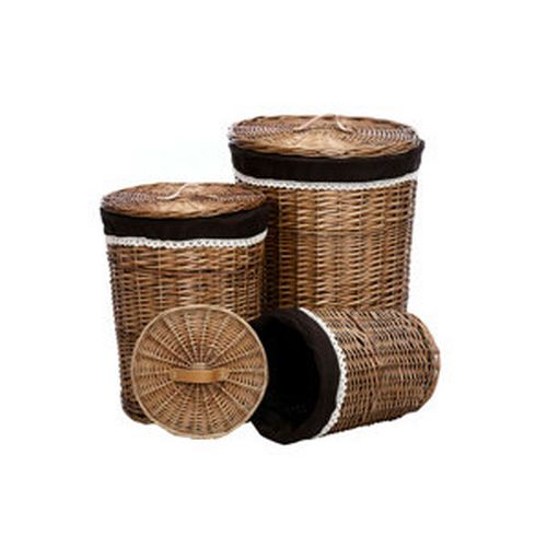 Sada 3 proutěných košů na prádlo s textilní vložkou. Uvnitř je hnědá textilní vložka s bílou krajkou - složení látky: 70% bavlna+30% polyester, praní na 30°C. Barva proutí: hnědá Rozměry: Malý 30x40x30 cm Střední 36x48x36 cm Velký 42x56x42 cm