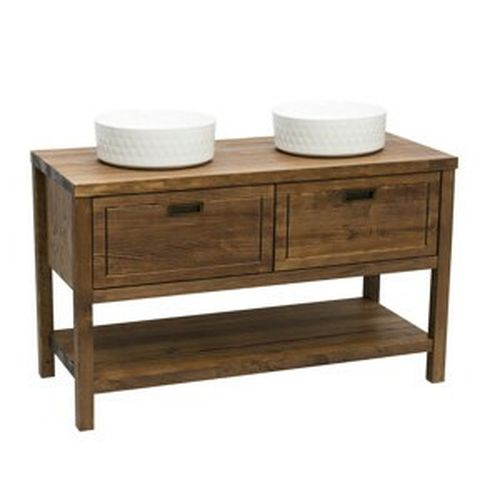 Koupelnová skříňka z masivního dřeva pro umyvadlo na desku v šíři 120 cm a stojícím provedení. Dvě zásuvky a jedna odkládací police.